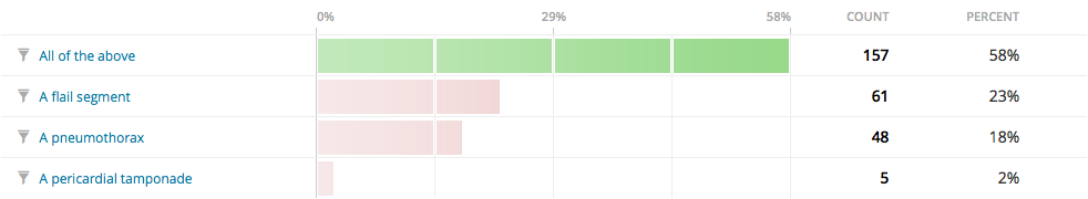OK. This is another tough one. The key word in the question is suspicious. We weren’t asking for a differential diagnosis, we were asking what things you needed to have floating in your head as possibilities, so you could make a differential diagnosis if the signs and symptoms of any of the above maladies showed up. While a flail segment and a pneumothorax are more probable than a pericardial tamponade, all three are possible, so you want to make sure you know how to differentiate.