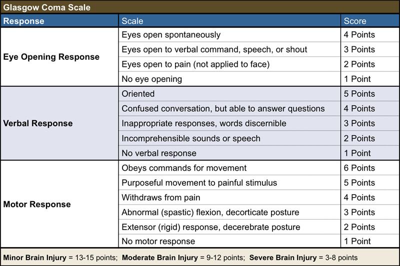 1. Level of consciousness: This is the measure of the patient’s mental acuity. Once you’ve established the AVPU, it’s good practice to use a tool like the Glasgow Coma Scale (GCS) to dial in the severity of the patient’s condition. A GCS of 13-15 is good-ish, 9-12 is not good, and 3-8 is bad. Understand that a dead person has a GCS of 3, and it’s the other vital signs that dial in that condition for you. The key on this is to continually assess your patient and see if he is going up or down the scale, because your treatment plan is going to get very aggressive very quickly if he going down. If you don’t use it every day, it’s easy to forget it, so always have a cheater on hand. Here’s a handy, printable chart:
