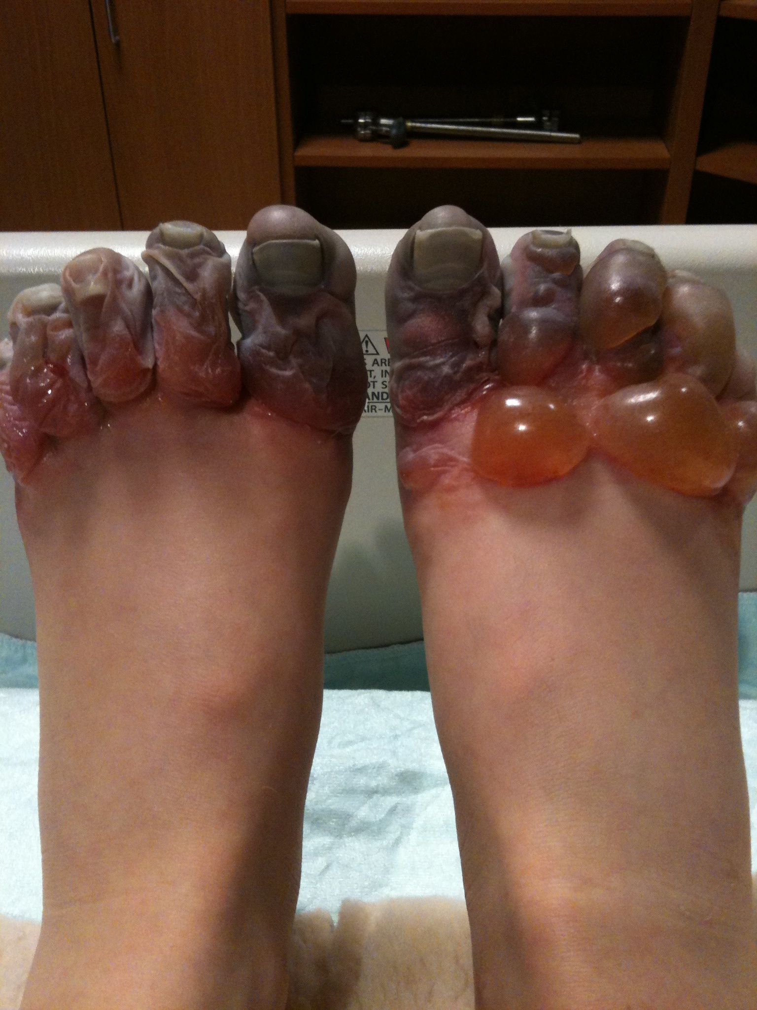 These feet are pretty bad, and the tips of the toes look like they are on the margin of gangrene, but this patient may be OK in the long run.